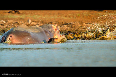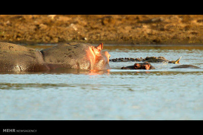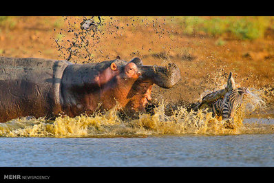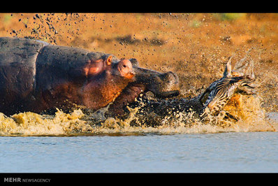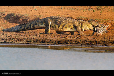 این تصاویر که در پارک ملی کروگر آفریقای جنوبی گرفته شده، نشان می دهد که چگونه یک گوره خر طعمه کروکدیلی گرسنه می شود، اما یک اسب آبی غول پیکر با زرنگی طعمه را از چنگ کروکدیل در می آورد .