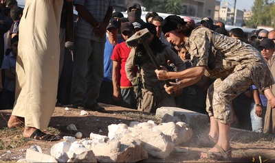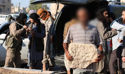 گروه تروریستی داعش همچنین امروز اعلام کرد که عناصر این گروه در یکی از ایست و بازرسیهای خود فردی را توقیف کردند که چند مجسمه از شهر تدمر را همراه خود داشت .. این فرد برای محاکمه به شهر منبج منتقل شد و حکمی برای مجازات او و نابود کردن مجسمه ها صادر شد.