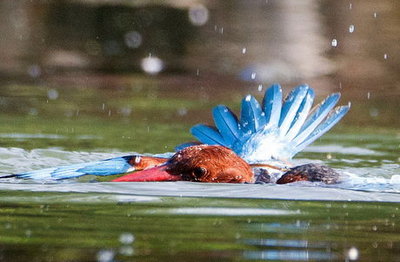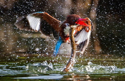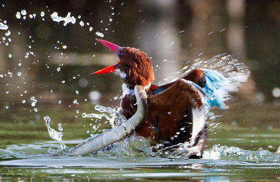 مرغ ماهیخوار با چشمان تیزش دنبال یک ماهی خوشمزه میگشت که گویا این بار اشتباه کرد. این مرغ بدشانس و گرسنه این بار لقمهای بزرگتر از دهانش برداشت. مرغ یک مار را از سطح آب بیرون کشید و وقتی دید مار خودش را به دور گردن او حلقه زده است، دستپاچه شد.