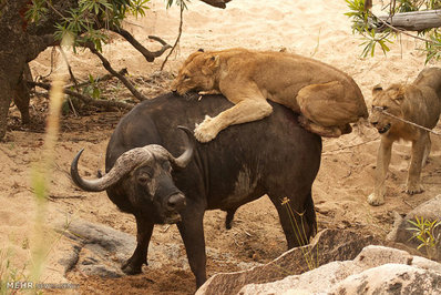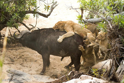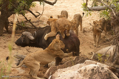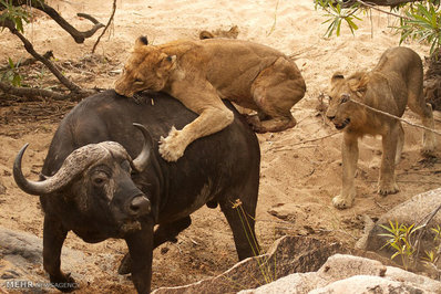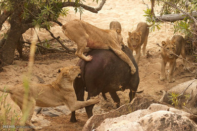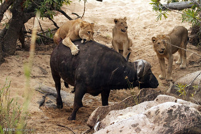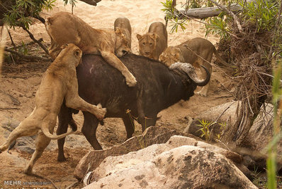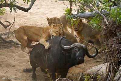 دسته ای از شیرهای گرسنه در منطقه لوندولیزی آفریقای جنوبی به یک بوفالوی نر حمله می کنند، اما تلاش آنها برای شکار این حیوان پوست کلفت بی ثمر می ماند.