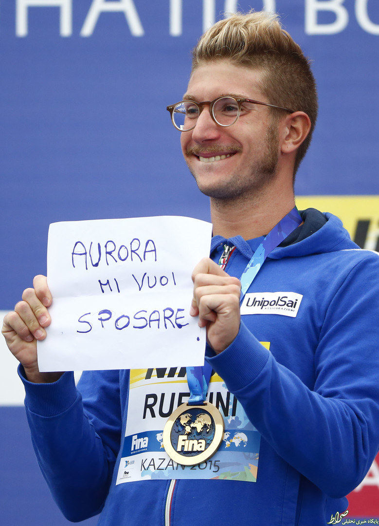 به گزارش سایت شبکه آر تی روسیه، "سیمونی روفینی" شناگر ایتالیایی به هنگام قرار گرفتن بر روی سکو برای دریافت مدال در مسابقات جهانی قازان (کازان) روسیه، نوشته ای را خطاب به دختر مورد علاقه اش در دست گرفت و خواستگاری مکتوب کرد.