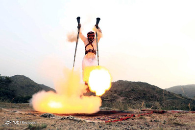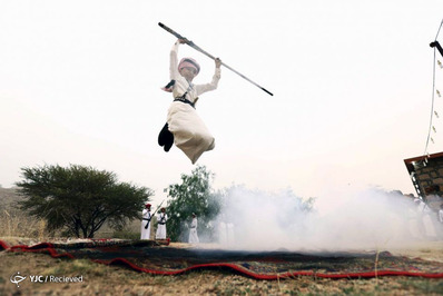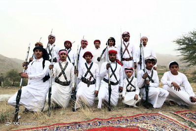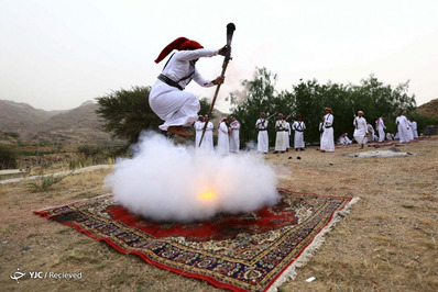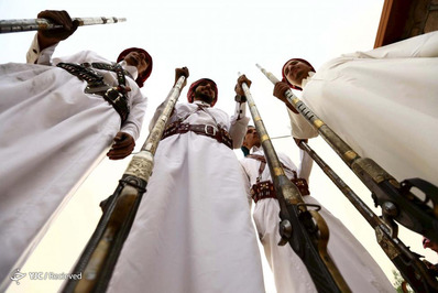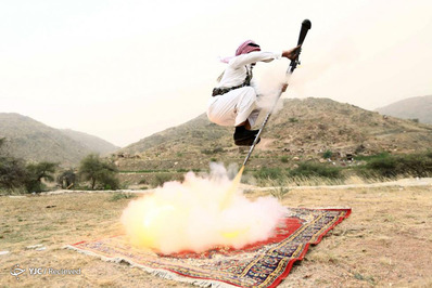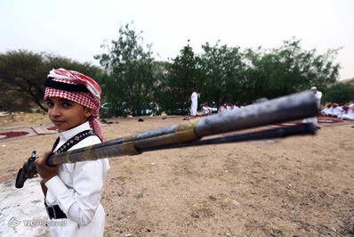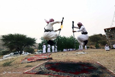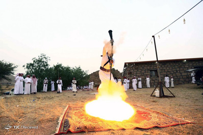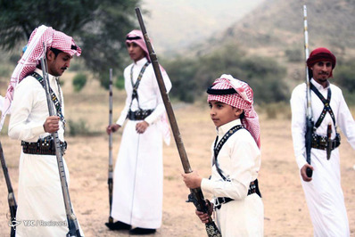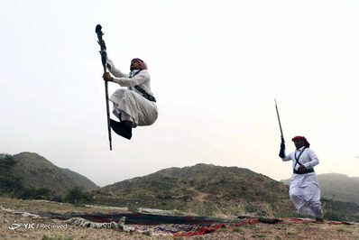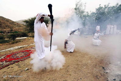 جوانان سعودی در این مراسم برای نمایش شجاعت خود از روی زمین پریده و در همان لحظه با یک تفنگ سر پر باروتی به زمین شلیک میکنند.