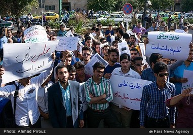 همزمان با برپایی نخستین جلسه علنی مجلس شورای اسلامی پس از تعطیلات تابستانه، صبح امروز یکشنبه ۲۵ مرداد جمعی از دانشجویان سراسر کشور و نمایندگان تشکلهای دانشجویی ضمن تجمع مقابل ساختمان مجلس خواستار بررسی توافقنامه وین توسط نمایندگان مجلس شدند.