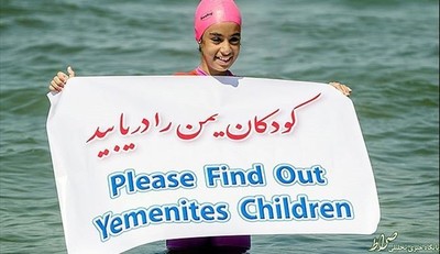 این دختر شناگر ایرانی پس از رکورد زنی با به دست گرفتن پلاکاردی با این نوشته که کودکان یمن را دریابید، از جامعه جهانی خواست که صلح را برای کودکان یمن به ارمغان آورند.