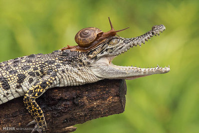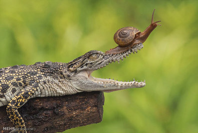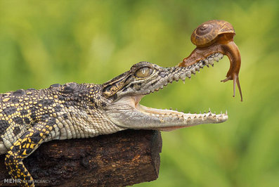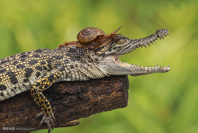 این تصاویر که در جنوب جاکارتا گرفته شده نشان می دهد که چگونه یک حلزون بالغ داخل دهان یک بچه کروکدیل سرک می کشد.