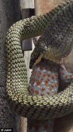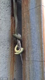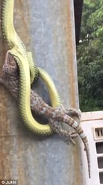 این تصاویر فوق العاده متعلق به لحظه شکار یک مار طلایی حین بلعیدن یک مارمولک در مجارستان است که در یک نبرد طولانی دو ساعته با شکارش سرگرم بود، اگر چه جثه مارمولک تقریبا با جثه مار برابریمیکرد اما مار با پیچیدن به دور بدن قربانیش را وادار به تسلیم شدن در برابر مرگ نمود.