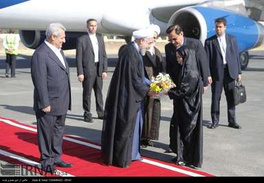 مجری مراسم استقبال، شعارهای "دسته گل محمدی به شهر ما خوش اومدی"، "صل علی محمد یاور رهبر آمد" و "محبوب هر ایرانی دکتر حسن روحانی" را تمرین کرد!