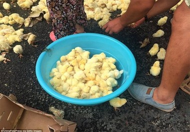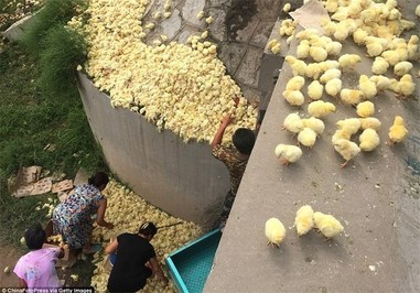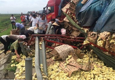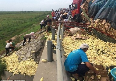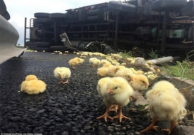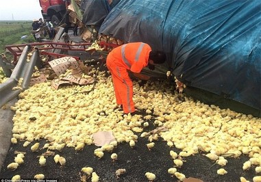 صراط: بر اثر واژگونی یک کامیون در بزرگراهی نسبتا شلوغ در شرق چین، بیش10 هزار جوجه یک روزه در مسیر بزرگراه سرازیر شدند.