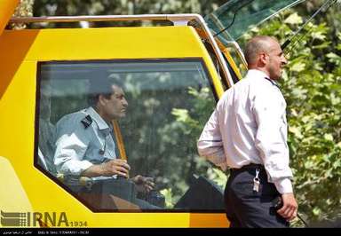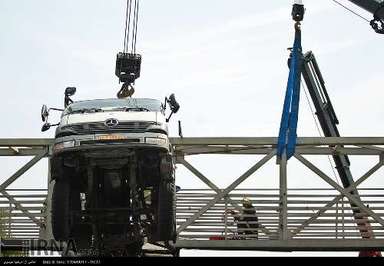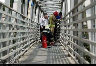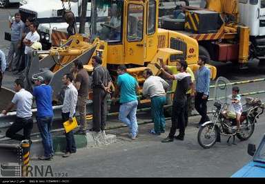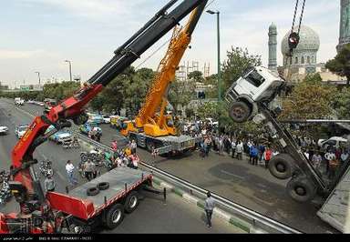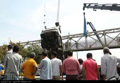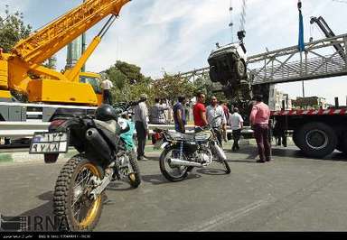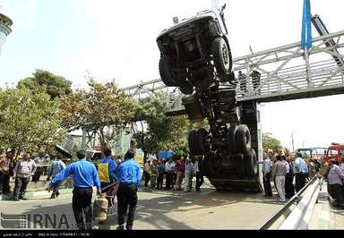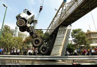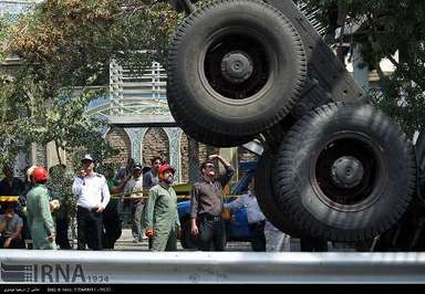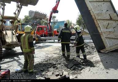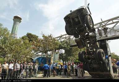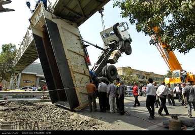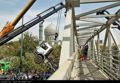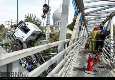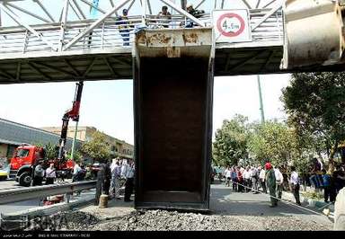 یک دستگاه کامیون کمپرسی در حال حرکت روز دوشنبه با پل عابر پیاده واقع در جنوب به شمال خیابان رجایی برخورد کرد و در وضعیت نامتعادل قرار گرفت. نیروهای آتش نشانی و شهرداری تهران در حال آزاد کردن این کامیون از زیر پل هستند.