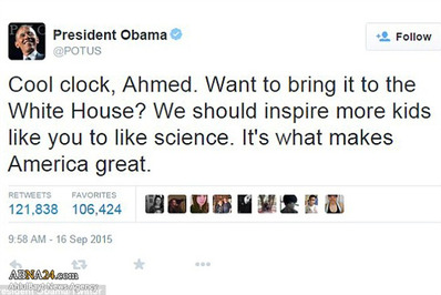 «باراک اوباما» رئیس جمهور آمریکا، در توئیتر خود خطاب به او نوشته: ساعت باحالی است احمد. میخواهی آن را به کاخ سفید بیاوری؟ ما باید بچههای بیشتری را تشویق کنیم تا مثل تو علوم را دوست داشته باشند. این چیزی است که آمریکا را با عظمت کرده است.