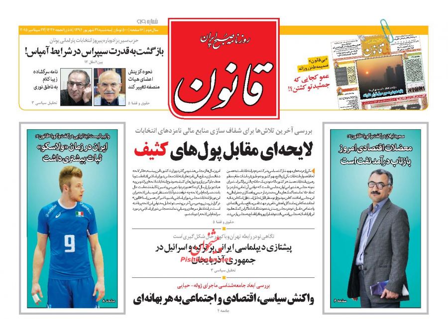 صفحه اول روزنامه های سه شنبه ۳۱ شهريور ۱۳۹۴