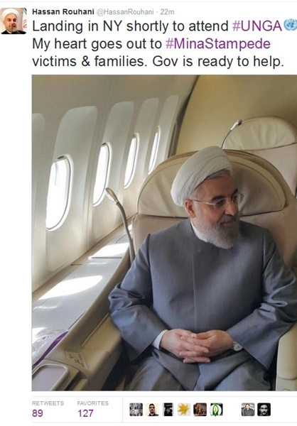 در این پست توئیتری آمده است: «تازه در نیویورک فرود آمدم تا در مجمع عمومی ملل متحد شرکت کنم. قلبم با خانوادهها و قربانیان حادثه منا است. دولت آماده کمک است.»