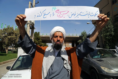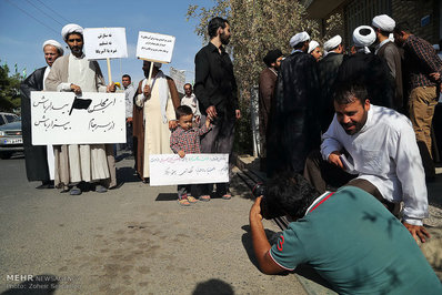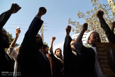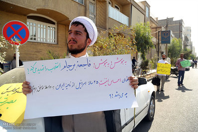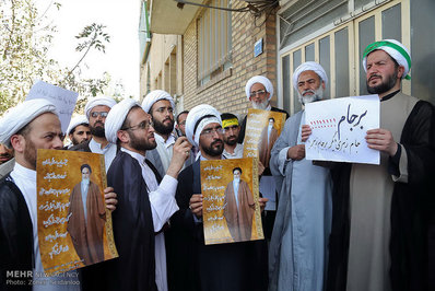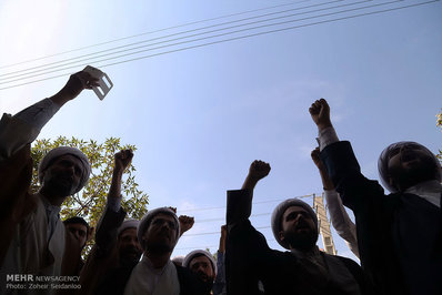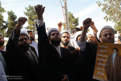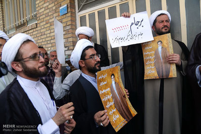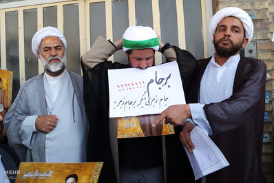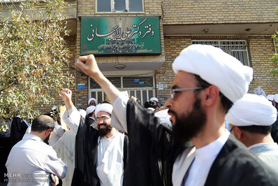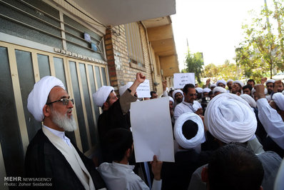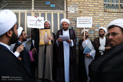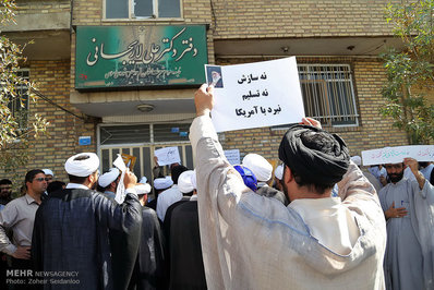 طلاب و روحانیون در اعتراض به تصویب و اجرای برجام ظهر امروز چهارشنبه مقابل دفتر رئیس مجلس در قم تجمع کردند.