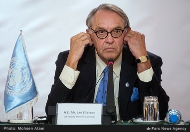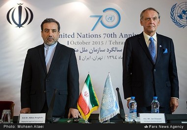 مراسم هفتادمین سالگرد تاسیس سازمان ملل متحد صبح دوشنبه بیستم مهرماه با حضور عباس عراقچی، معاون وزیر امور خارجه و یان الیاسون، قائممقام دبیرکل سازمان ملل متحد در دفتر مطالعات سیاسی و بینالملل وزارت امورخارجه برگزار شد. یان الیاسون در خصوص تلاشها برای تجزیه عراق گفت: تمامیت ارزی و حاکمیت کشورها همواره در سازمان ملل مورد تاکید قرار گرفته است. ما باید اجازه دهیم که کشورهای عضو، آینده خود را خودشان رقم بزنند. من نسبت به گسترش جنگهای نیابتی در منطقه هشدار میدهم.