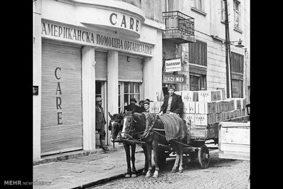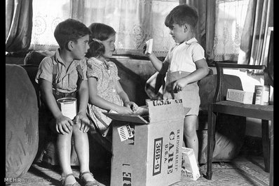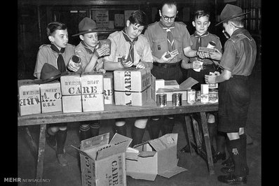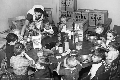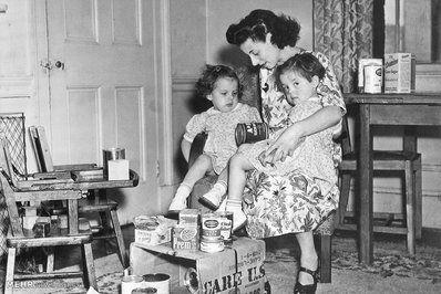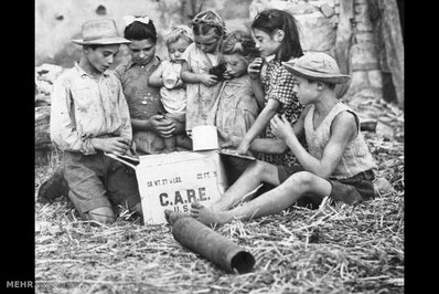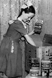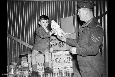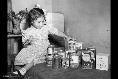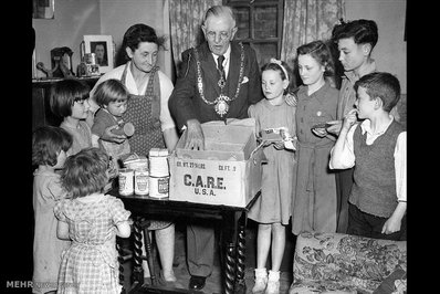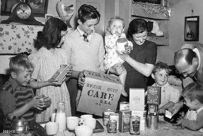 این تصاویر روزهای بعد از جنگ جهانی دوم را نشان می دهد که خانواده های انگلیسی برای سیر کردن شکم خود، از بسته های مواد غذایی ای که ثروتمندان آمریکایی برایشان ارسال می کردند استفاده می کردند.