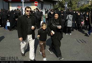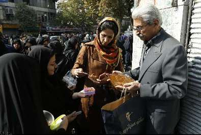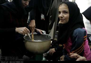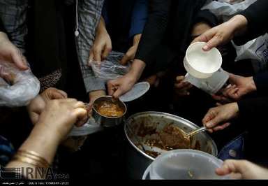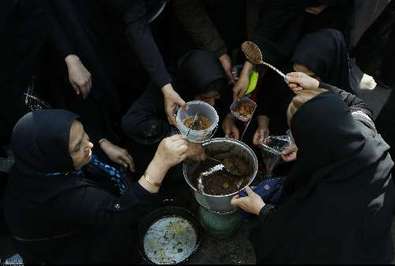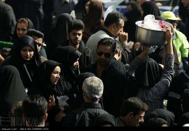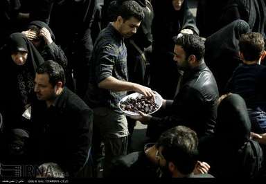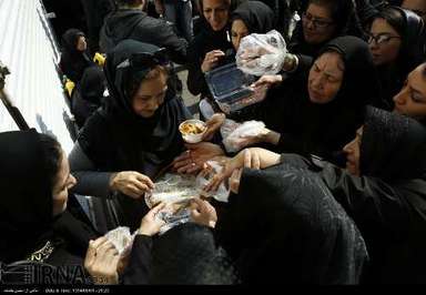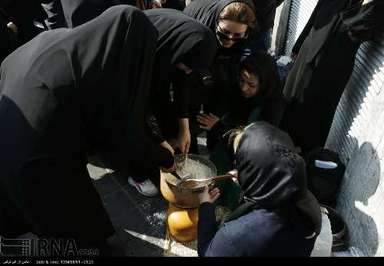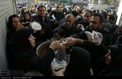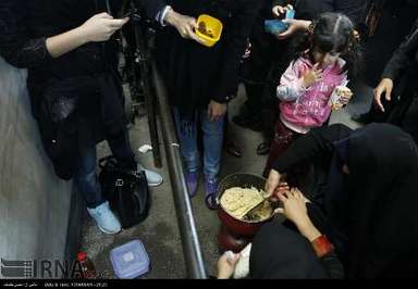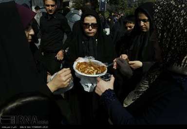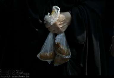 همزمان با عزاداری تاسوعای حسینی عاشقان اهل بیت (ع) به تهیه و توزیع حلوای نذری بین عزاداران حسینی در معابر سطح شهر تهران پرداختند. تصویر، توذیع حلوای نذری در گلوبندک را نشان می دهد.
