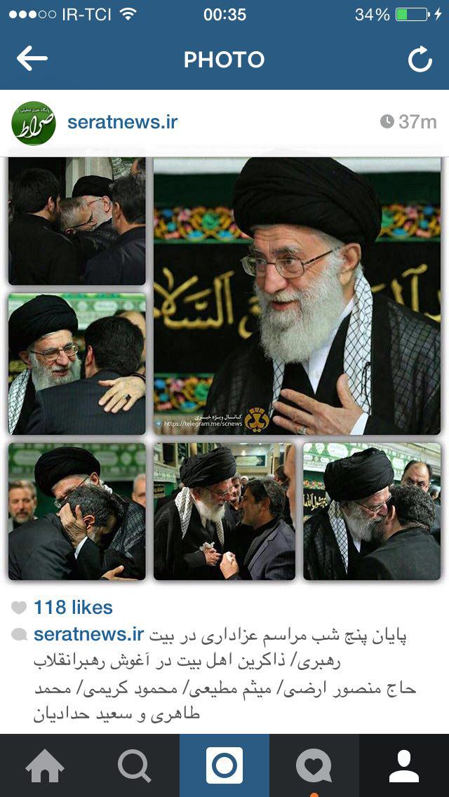 اينستاگرام صراط با انتشار اين عكس نوشت: پایان پنج شب مراسم عزاداری در بیت رهبری/ ذاکرین اهل بیت،حاج منصور ارضی، حاج میثم مطیعی، حاج محمود کریمی،حاج محمد طاهری و حاج سعید حدادیان در آغوش رهبرانقلاب.