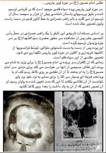 یکی دیگر از مطالب منتشر شده در این زمینه ماجرایی از چگونگی ترسیم تصویر امام حسین(ع) توسط یک نقاش مسیحی و نگهداری این تصویر در موزه لوور پاریس است!