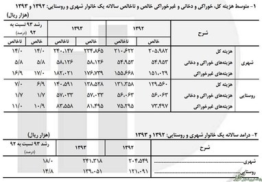 از سوی دیگر، متوسط هزینه های غیر خوراکی شهریها در سال 93 حدود 17 درصد بیشتر شده که تقریباً معادل تورم 17.2 درصدی اقلام غیر خوراکی در این سال است.