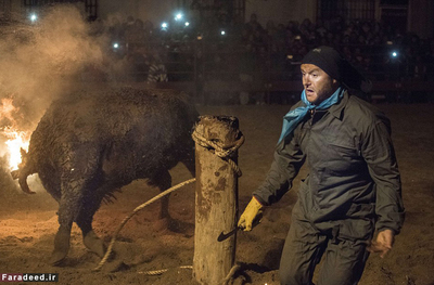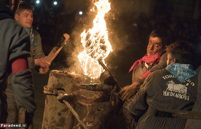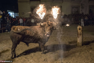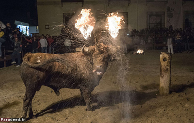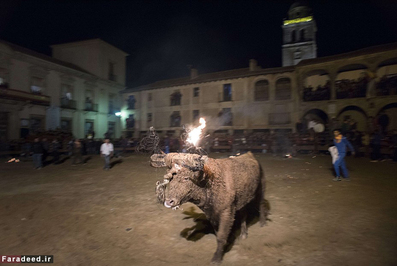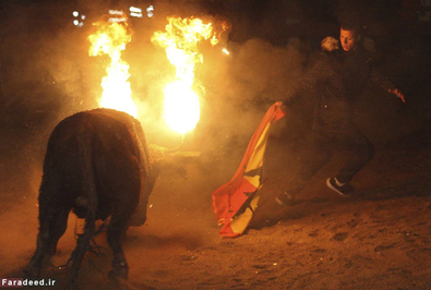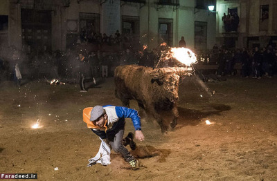 جشنواره سنتی گاوشعله ور" که با قدمتی حدود 400 سال در کشورهایی چون اکوادور و پرو با عنوان گاو دیوانه نیز شناخته می شود آئین سنتی است که در آن گلوله های آتشین را به شاخ های گاو میبندند و حیوان را رها میکنند. این فستیوال امسال نیز در "مدیناسلی" اسپانیا که به عنوان پایتخت آن شناخته میشود برگزار شد و در حالیکه گروههای دفاع از حقوق حیوانات نسبت به برگزاری آن اعتراض کردند با این حال علاقمندان به این فستیوال تخته و پارچه های آغشته به مواد آتش زا را به شاخ گاوهای نر بستند و حیوان وحشت زده را در شهر رها کرده و خود به دنبال انها دویدند. عکس های گتی ایمیج از فستیوال امسال را در زیر میبینید.