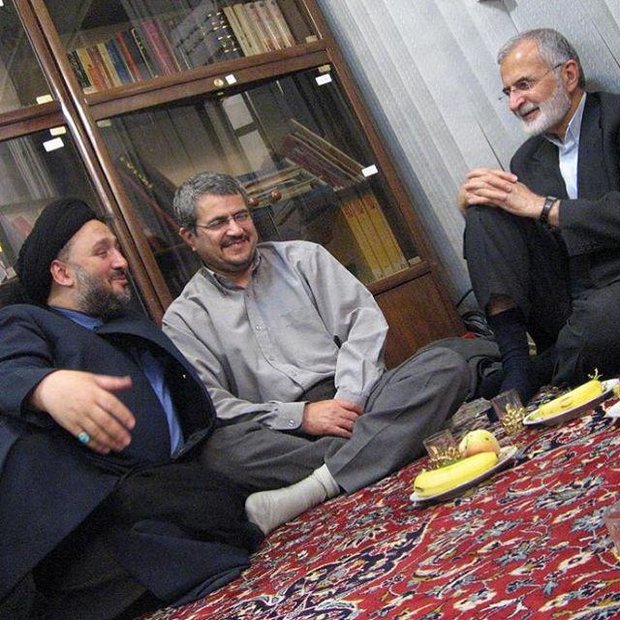محمد علی ابطحی در توضیح این عکس نوشته است: از عكس هاي قديمي در دوران فوق چاقي من. از عكس هاي كميابي كه اقاي كمال خرازي لبخند به لب دارد.