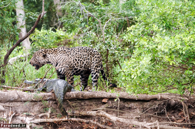 راهنمای تورگردشگری در منطقه جنگلی "پانتانال" دو روز قبل شاهد لحظات نادر حمله پلنگ گرسنه به یک تمساح و شکار او بود.