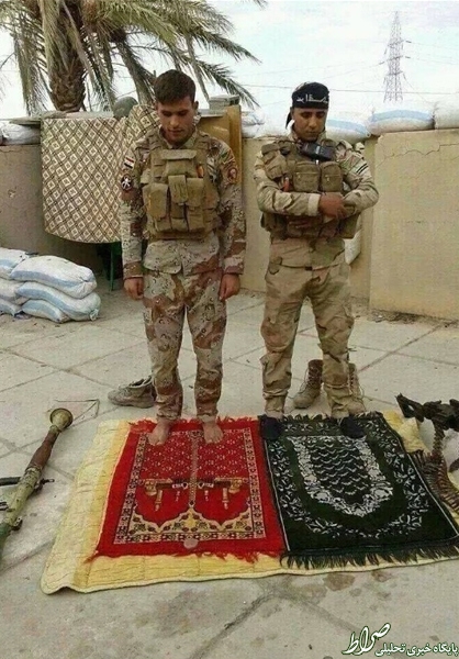 تصویری از نماز خواندن یکی از رزمندگان اهل سنت در کنار رزمنده شیعه را مشاهده می‌کنید.