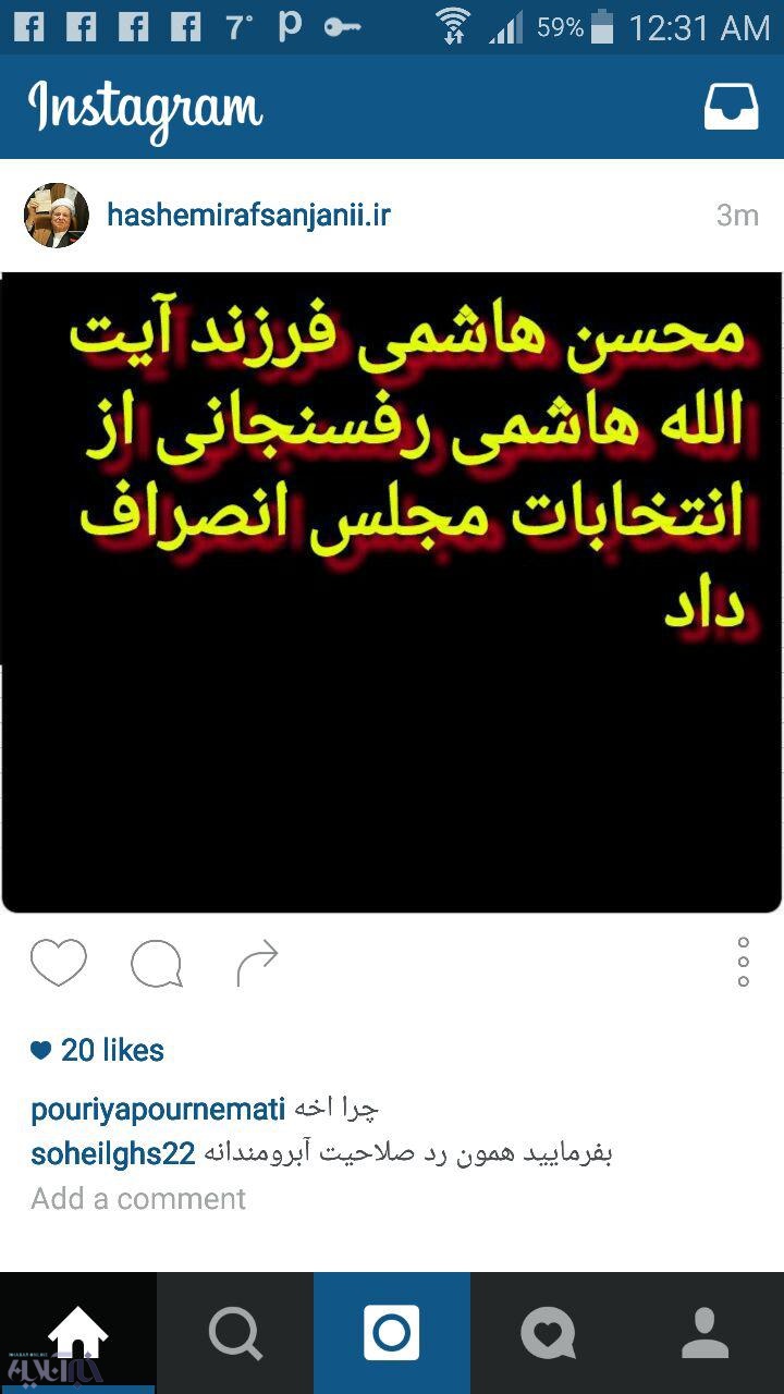 صفحه اینستاگرام دفتر آیت الله هاشمی رفسنجانی اعلام کرد که فرزند وی، محسن هاشمی از نامزدی در انتخابات مجلس دهم انصراف داده است.