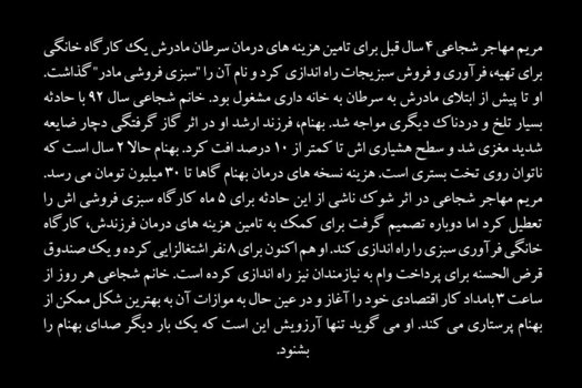 مریم مهاجر شجاعی ۴ سال قبل برای تامین هزینه های درمان سرطان مادرش یک کارگاه خانگی برای تهیه، فرآوری و فروش سبزیجات راه اندازی کرد و نام آن را «سبزی فروشی مادر» گذاشت...