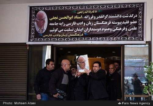 پیکر مرحوم ابوالحسن نجفی چهره پیشکسوت زبان و ادبیات فارسی و ترجمه صبح سه شنبه ششم بهمن ماه با حضور اهالی فرهنگ از مقابل فرهنگستان زبان و ادب فارسی به سمت قطعه نام آوران بهشت زهرا(س) تشییع شد.