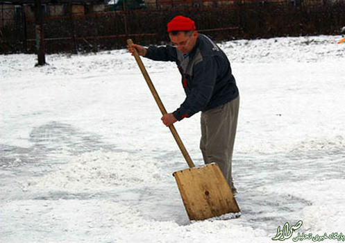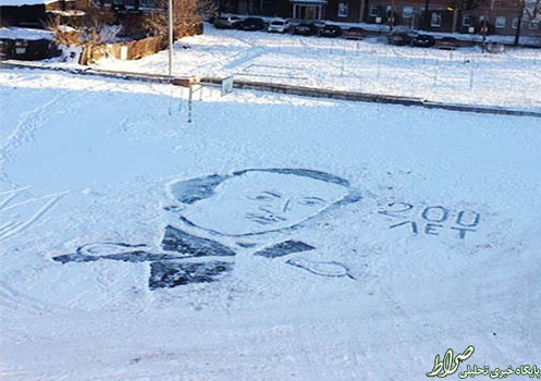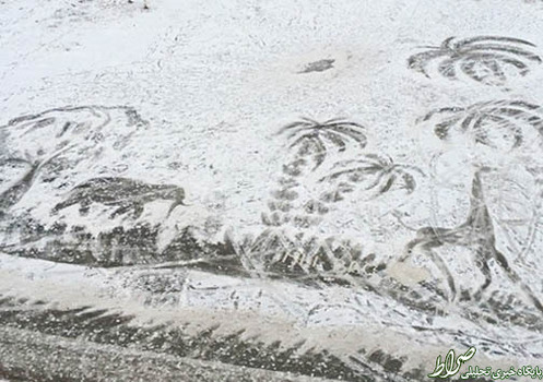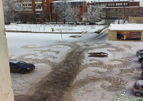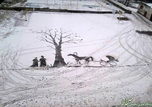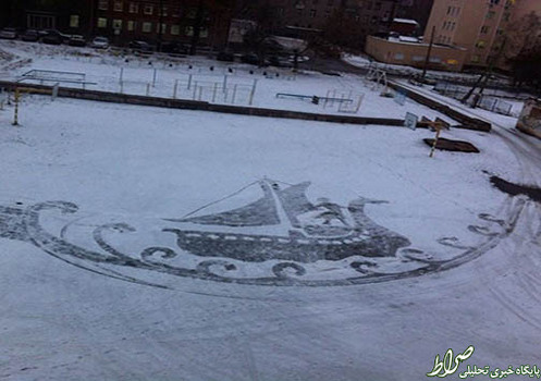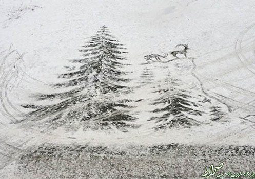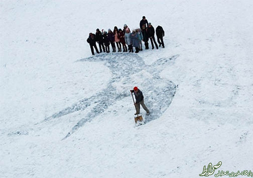 سیمن با یک پارو یا بیل روی برف نقاشی میکشد. او میگوید: ایدهی نقاشی