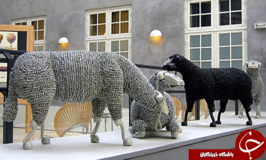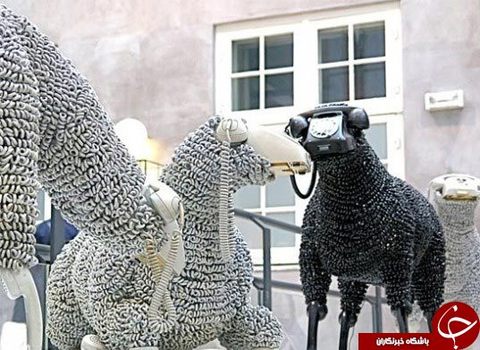 صراط: جان لوک هنرمند آلمانی که در مدرنترین ابتکار  خود با الگوبرداری از پیکره گوسفند، سازه نگهداری تلفن منزل را پیاده سازی کرده است.