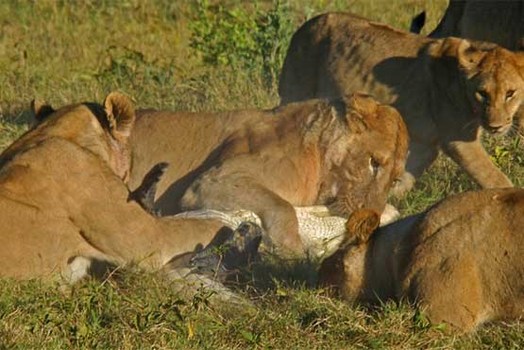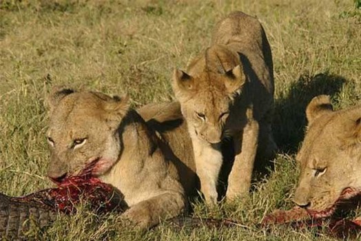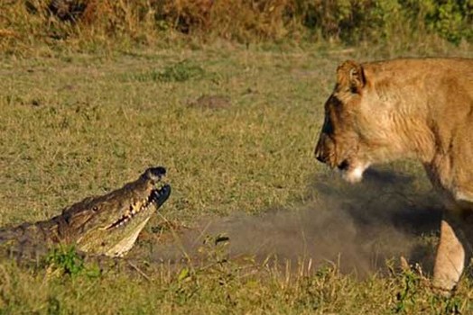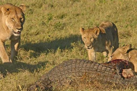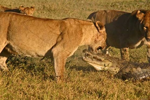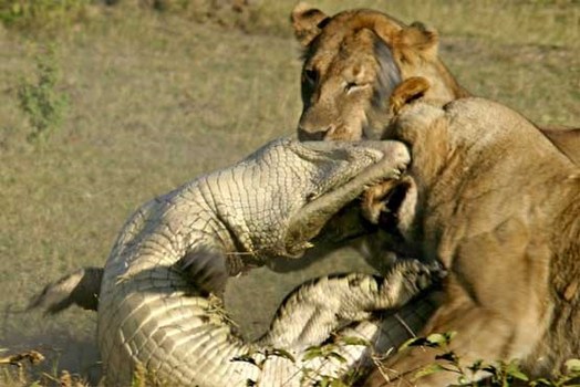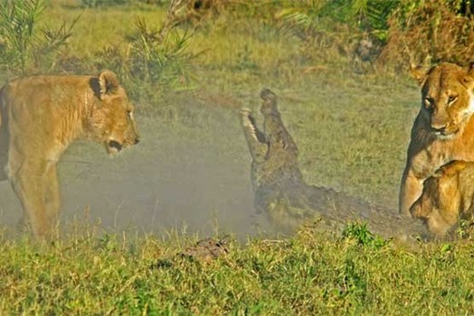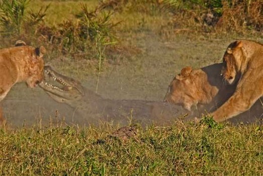 گرچه معمولا شیرها به حیواناتی چون گاومیش، بوفالو، ایمپالا، زبرا، گراز زگیل‌دار و گراز حمله می کنند اما در پدید ای نادر ماده شیرهای گرسنه در منطقه حیات وحش بوتسوانا یک کروکودیل تنها را به عنوان شکار انتخاب کردند. تونی گودمن 58 ساله و فرزندش که همراه با یک تور گردشگری به منطقه حفاظت شده "بوتسوانا" رفته بود موفق شد این اتفاق خارق العاده را عکاسی کند. عکس های او نشان می دهد این کروکودیل تنها در محاصره گله شیرها فقط می تواند یکی از آنها را زخمی کند اما شانسی برای زنده ماندن ندارد. ماده شیرها با بی رحمی او را می کشند و شروع به خوردن می کنند.
