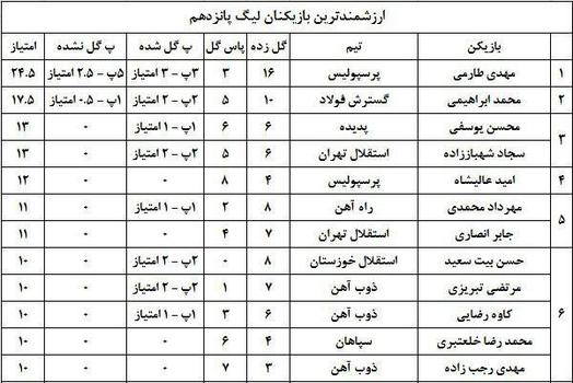 مهاجم گلزن پرسپولیسیها که بازی اخیر این تیم را به دلیل محرومیت از دست داد تاکنون با 16 گل زده در صدر گلزنان لیگبرتر قرار گرفته است. طارمی با گرفتن 8 پنالتی در این آیتم نیز رکورددار است. پنالتیهایی که تنها 3 گل برای پرسپولیس به همراه داشتند. مهاجم پرسپولیسیها که آخرین بازیش با این تیم دربی بزرگ تهران بود تاکنون 3 پاس گل نیز برای همبازیانش ارسال کرده است.دوم: محمد ابراهیمی ـ 17.5 امتیاز