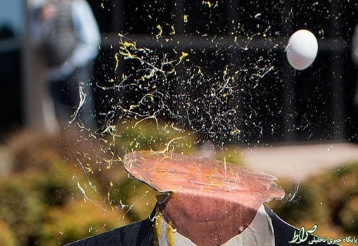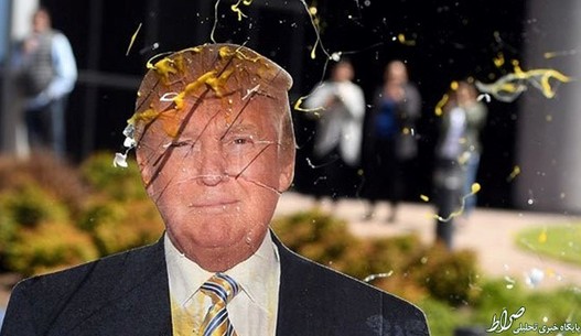 بعضی هم برای نشان دادن اعتراض خود، به سوی عکس ترامپ تخم مرغ پرتاب کردند.