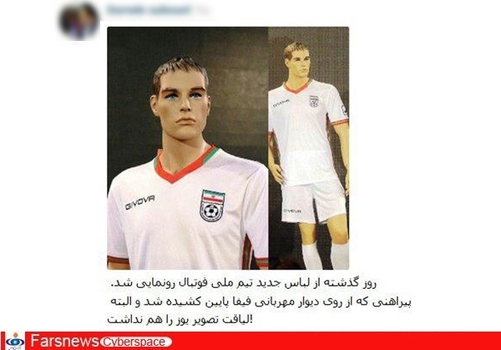 خصوصاً این که با یک حرکت هوشمندانه این لباس زیبا رو تن مانکنى با لبهاى پروتز و چشمهاى آبى سایه زده کردن تا لرزه بر اندام تمام رقباى تیم ملى در جام جهانى بیفته.