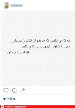 - به نظرم الان کارلوس کیروش باید لباس تیم ملی رو بفرسته برا فیفا بگه این وضع پوشش لباس تیم ما هست بازم هرجور خودتون صلاح میدونید