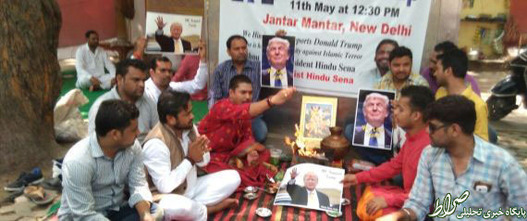 اعضای این گروه در یک پارک در شهر دهلی نو فرشی را پهن کردند و مجسمه های چند الهه خود از جمله شیوا، هانومان و تصاویر خندان ترامپ را کنار خود قرار دادند.