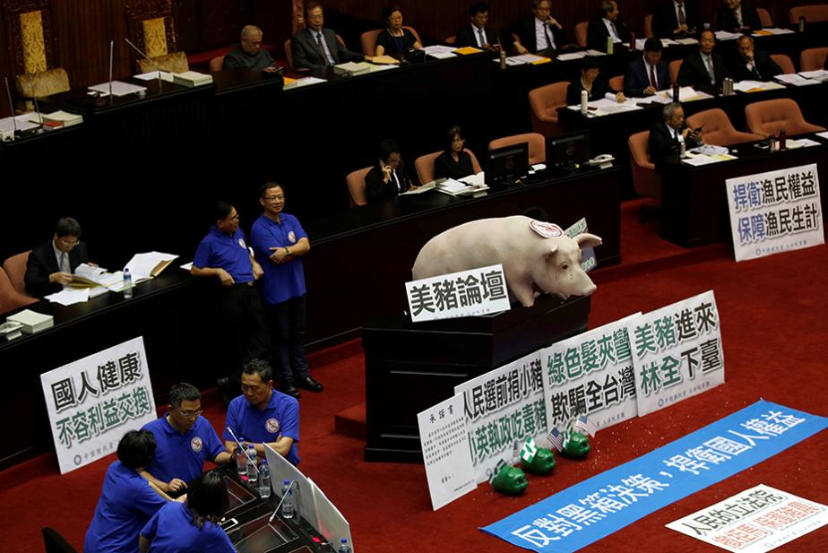 نمایندگان حزب ملی مردم (حزب حاکم) در تایوان، در اعتراض به واردات گوشت خوک از آمریکا، یک خوک مصنوعی را به نشانه اعتراض در تریبون پارلمان تایوان قرار دادند. هدف آنان ممانعت از سخنرانی و ارائه گزارش توسط لین چوان، نخست وزیر در آخرین روز ماه مه سال جاری و نیز مخالفت با واردات گوشت خوک از آمریکا بود که به باور آنان حاوی افزودنی خوراکی راکتوپامین است. عکس از رویترز، تیرونه سیو