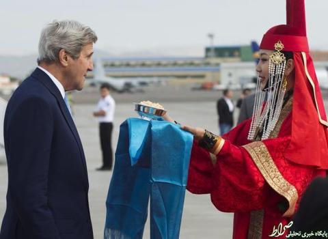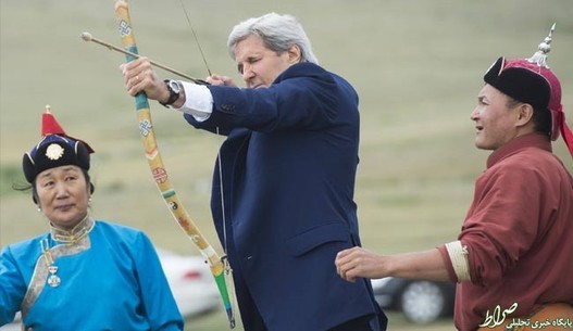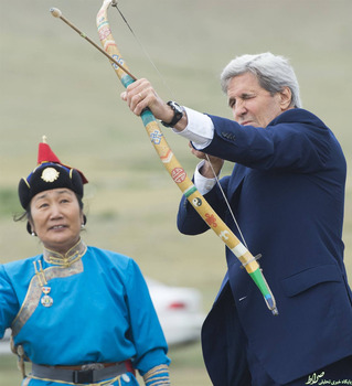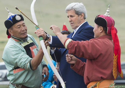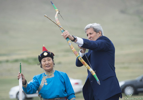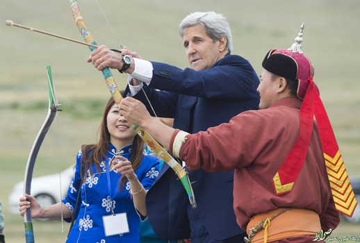به گزارش العالم، جان کری در جریان مراسم سنتی استقبال سعی کرد با کمان مغولها تیراندازی کند.