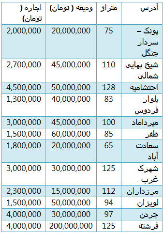 باشگاه خبرنگاران نوشت: قیمت رهن و اجاره آپارتمان در مناطق مختلف تهران به شرح زیر است: