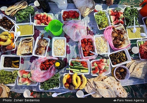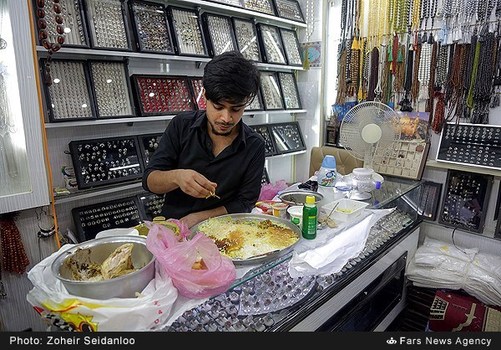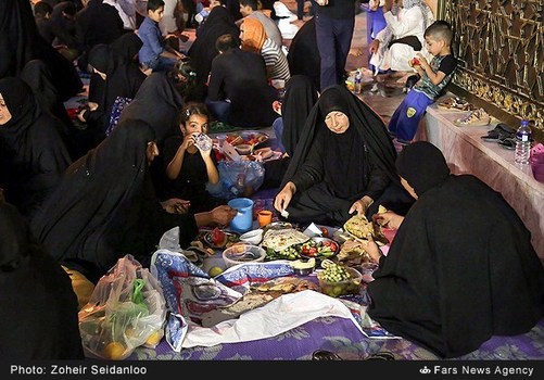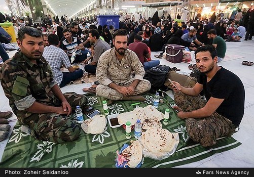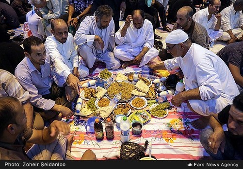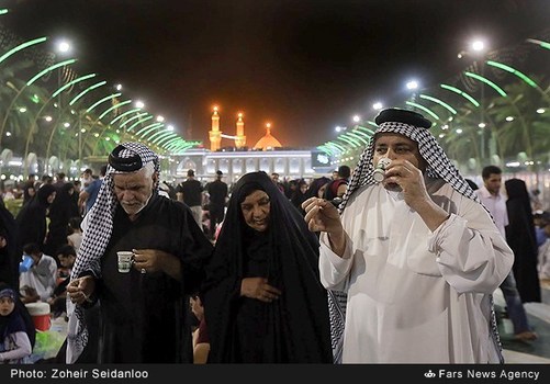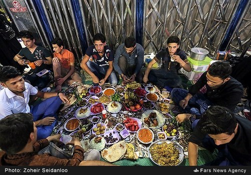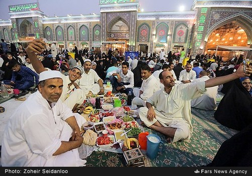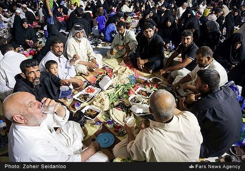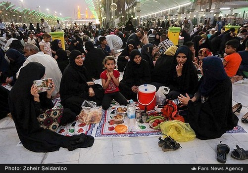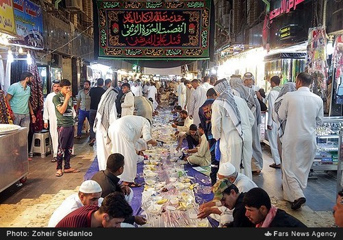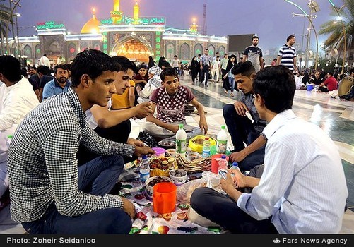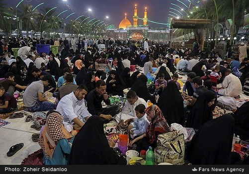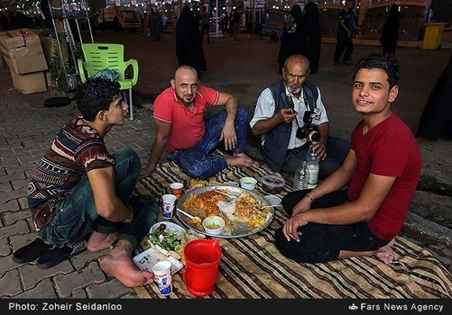 سفره های افطاری پهن شده در بین الحرمین حال و هوای دیگری را برای عاشقان اباعبدالله رقم می زند.زائرانی که به عشق حضرت سیدالشهدا(ع) روزه خود را افطار میکنند.