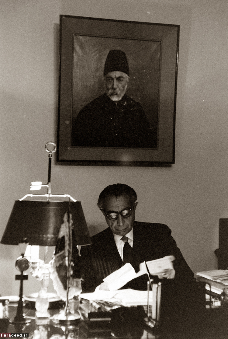 عکسی دیده نشده از علی امینی در دفتر کارش در سالهای نخست وزیری؛ عکس بالای سر امینی تصویر جدش میرزا علی خان امین الدوله از رجال با نفوذ قاجار و صدراعظم مظفرالدین شاه است. گفتنی است 19 تيرماه سال 1341 علی امینی نخست وزیر وقت در جلسه شوراي وزيران با حضور شاه بر سر بودجه ارتش با وی مخالفت کرد و حتی شایعه مشاجره نخست وزیر و شاه در محافل پیچید. اميني چند روز بعد ضمن تائید شایعه مطرح شده اعلام کرد اگر شاه با كاهش بودجه درخواستي ارتش موافقت نكند راهي جز كناره گيري ندارد چرا که دولت در آستانه ورشگستگي اقتصادی است و توان پرداخت این بودجه را ندارد.