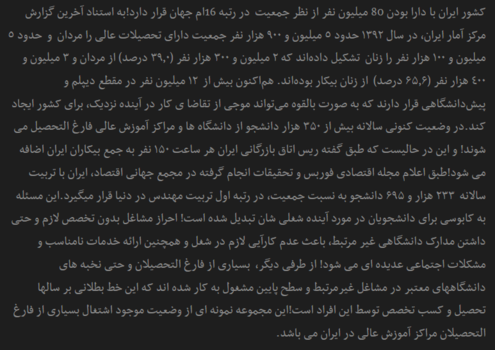 کشور ایران با دارا بودن 80 میلیون نفر از نظر جمعیت در رتبه 16ام جهان قرار دارد!به استناد آخرین گزارش مرکز آمار ایران، در سال ١٣٩٢ حدود ٥ میلیون و ٩٠٠ هزار نفر جمعیت دارای تحصیلات عالی را مردان و حدود ٥ میلیون و ١٠٠ هزار نفر را زنان تشکیل داده‌اند..
