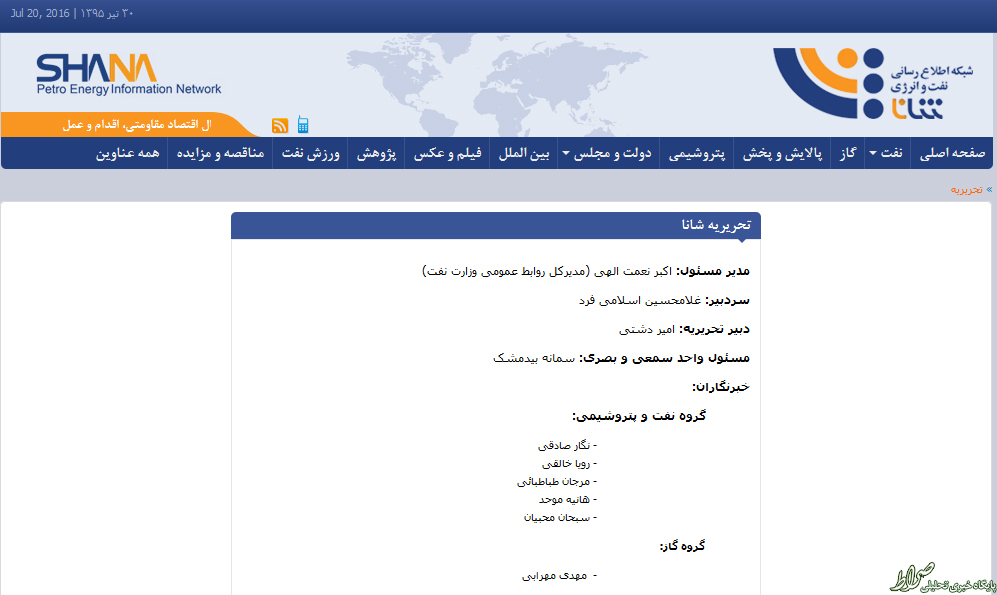 نام اسلامی فرد به عنوان سردبیر شانا، سایت رسمی وزارت نفت درج شده است