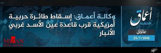 گروه تروریستی داعش با انتشار تصاویری مدعی ساقط کردن یک جنگنده متعلق به ناوگان هوایی ارتش آمریکا در نزدیکی پایگاه هوایی "عین الاسد" در استان الانبار عراق شد. این در حالی است که مقامات آمریکایی صحت این خبر را زیر سوال برده اند.