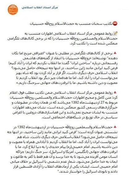 روابط عمومی مرکز اسناد انقلاب اسلامی ضمن تکذیب مطلب فوق اعلام کرد: متن کامل و صحیح اظهارات حجتالاسلام والمسلمین روحالله حسینیان مربوط به 27 اردیبهشتماه 1392 میباشد که در همان زمان در مطبوعات و خبرگزاریهای رسمی کشور منعکس شده است، نشان میدهد اظهارات منتسب به ایشان صحیح نمیباشد و این فضاسازیهای دروغین با اغراض سیاسی در حال توزیع در شبکههای اجتماعی است.