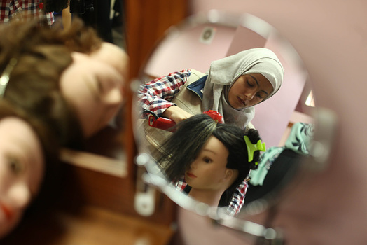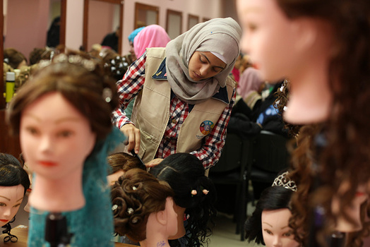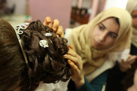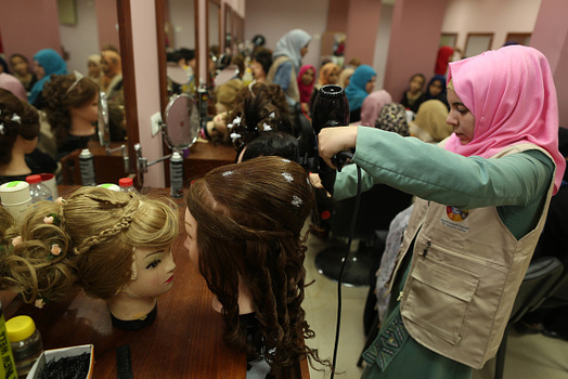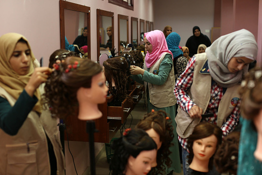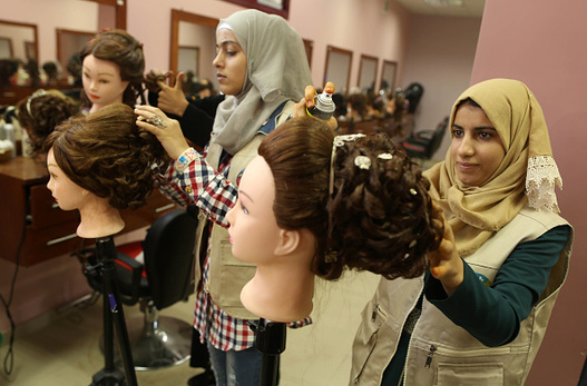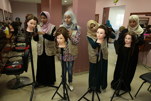 گروهی از دختران فلسطینی در شهر غزه در یک آرایشگاه زنانه آموزش میبینند.