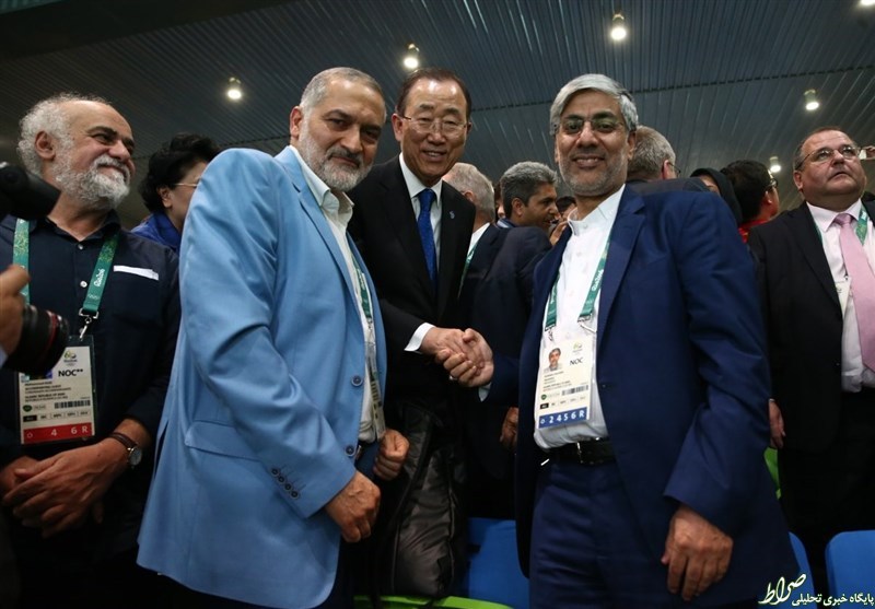 کیومرث هاشمی رئیس کمیته ملی المپیک و سید مهدی هاشمی رئیس فدراسیون تیراندازی در حاشیه رقابتهای تیراندازی تنفگ 10 متر بانوان با «بان کی مون» دبیرکل سازمان ملل ضمن خوش بش عکسی یادگاری انداختند.