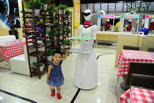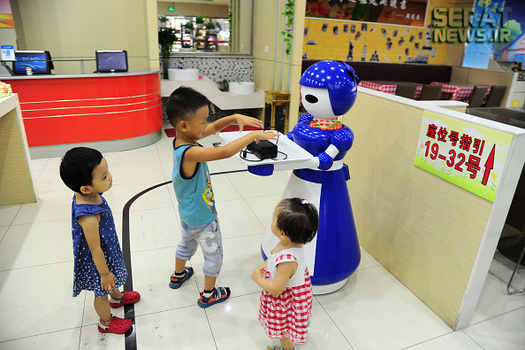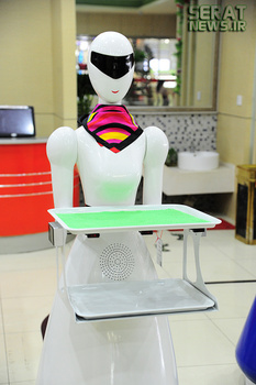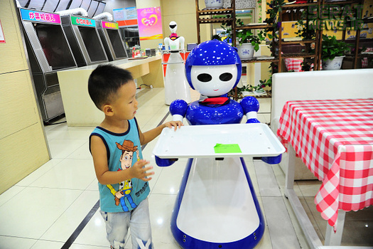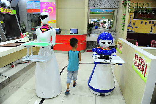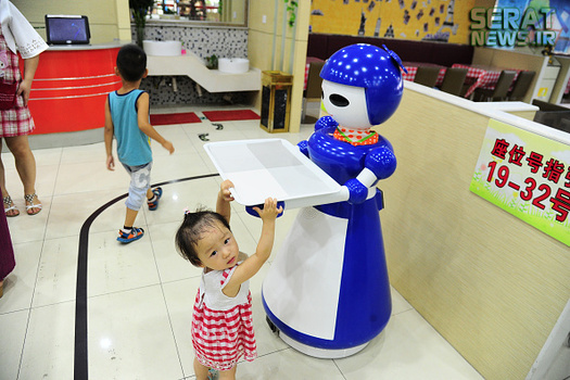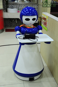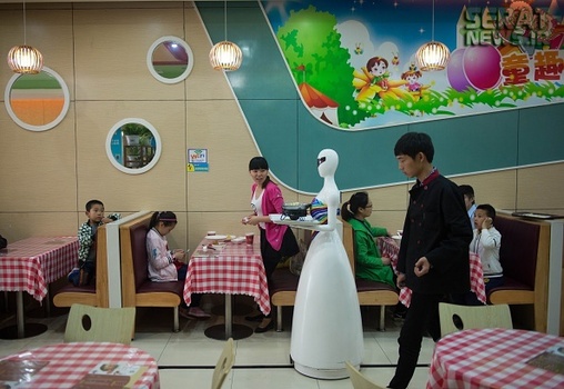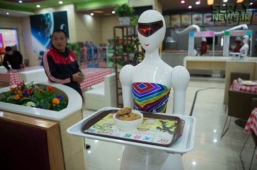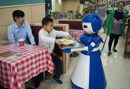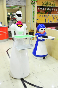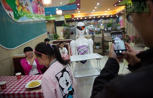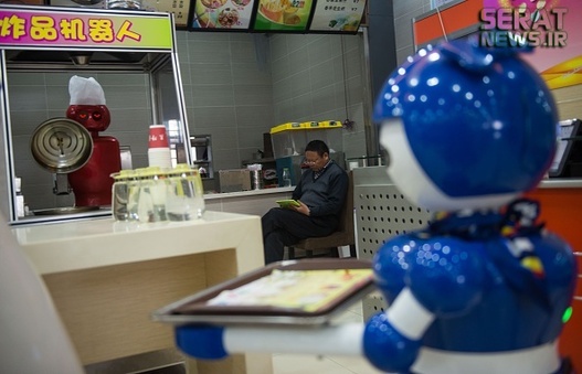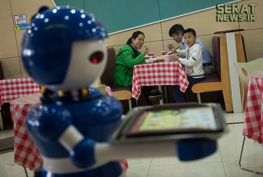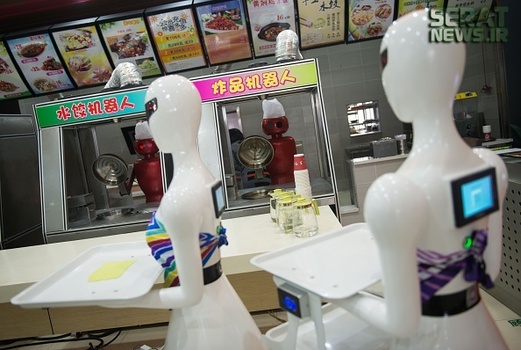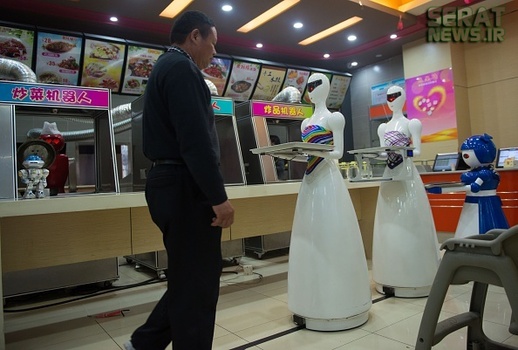 در یک رستوران در شهر کونشان استان جیانگ سوی چین از نسل چهارم رباتها به عنوان پیشخدمت به جای نیروی انسانی استفاده میشود.